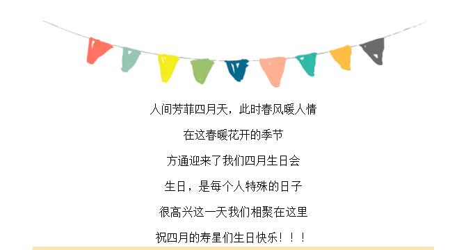 人間芳菲四月天,此時(shí)春風(fēng)暖人情在這春暖花開(kāi)的季節方通迎來(lái)了我們四月生日會(huì )生日,是每個(gè)人特殊的日子很高興這一天我們相聚在這里祝四月的壽星們生日快樂(lè )。!